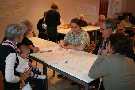 A történet kiscsoportos feldolgozására az előadás után került sor. Az előzőleg húzott csoport számok alapján a jelenlevő 30 felnőttet 4 csoportra osztottuk. A csoportban lévők rövid bemutatkozása után beszélgettünk az elhangzottakról az életünkből is merített történetekkel együtt. Több mindent megtudtunk egymásról, életünkről és a körülöttünk élőkről. Kérdésekre adott válaszok alapján összegeztük a csoport munkát és beszámoltunk az átgondoltakról.
